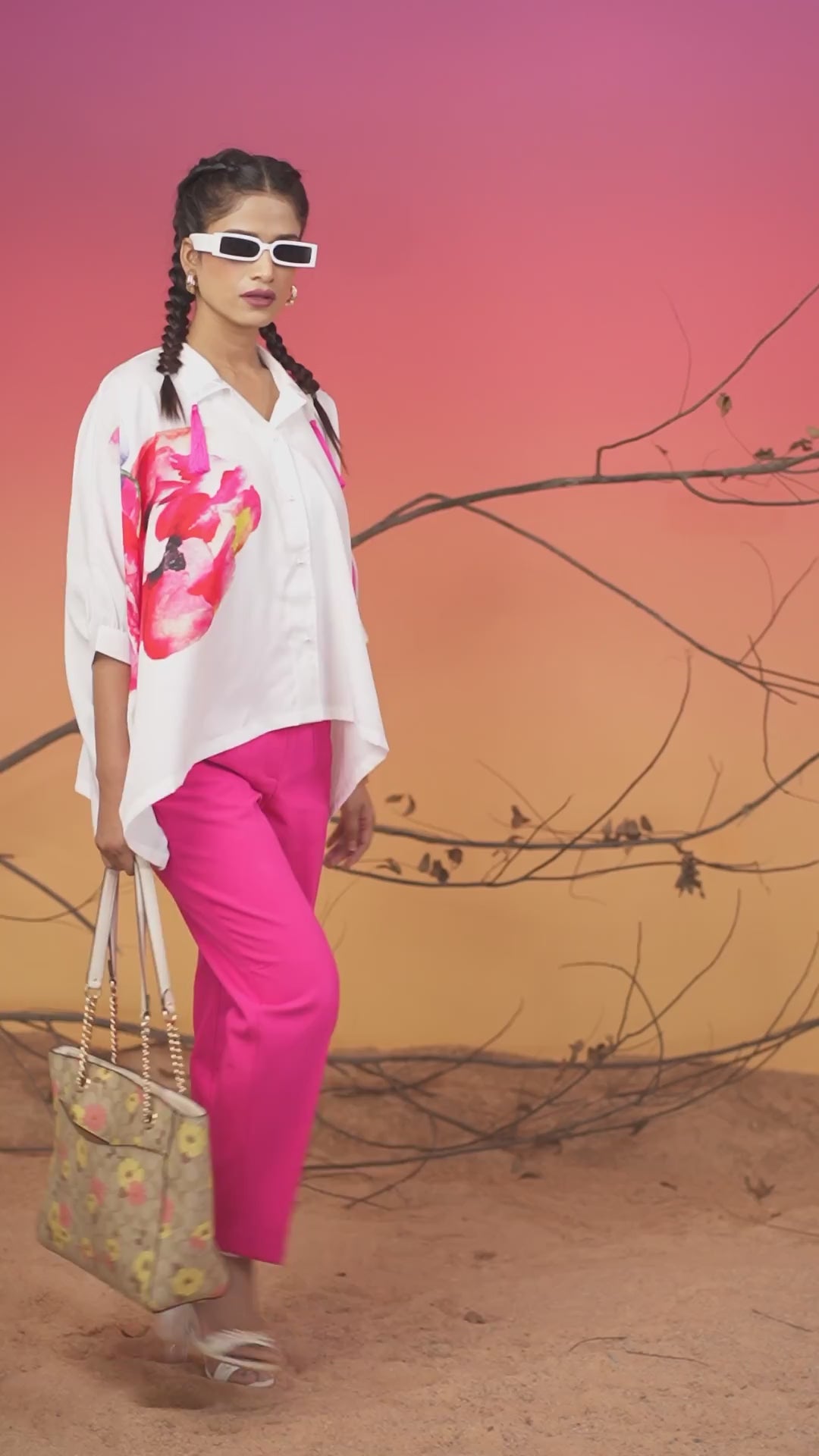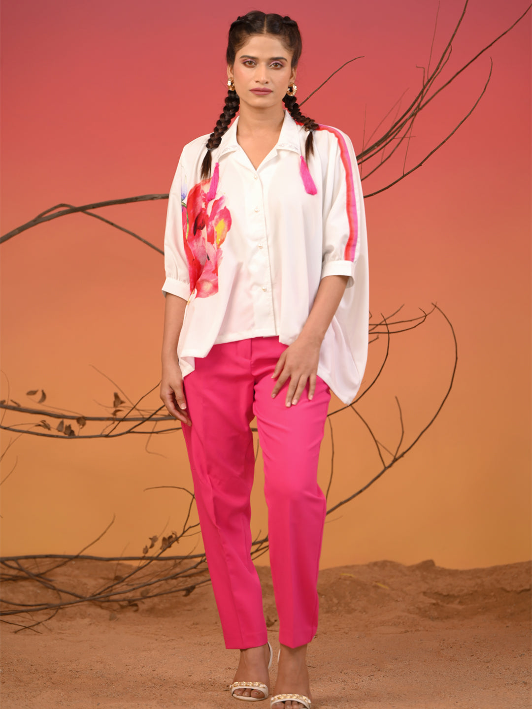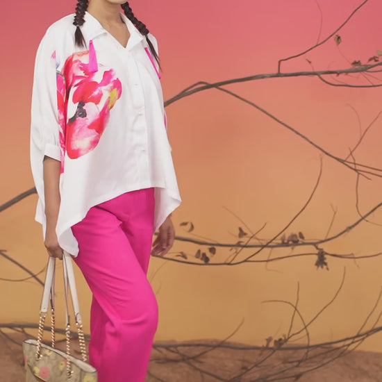 Effortlessly chic and endlessly versatile, the painted floral design printed women’s shirt in flowy fabric is a wardrobe essential that blends comfort with contemporary style. Crafted from lightweight fabric, this shirt offers a graceful drape and airy feel, making it perfect for all-day wear. Adorned with eye-catching prints, tassels and stone embellishments, this shirt adds a pop of personality to any outfit. The relaxed silhouette enhances movement and creates a flattering fit, whether tucked into tailored trousers for work or paired with jeans for a casual outing.