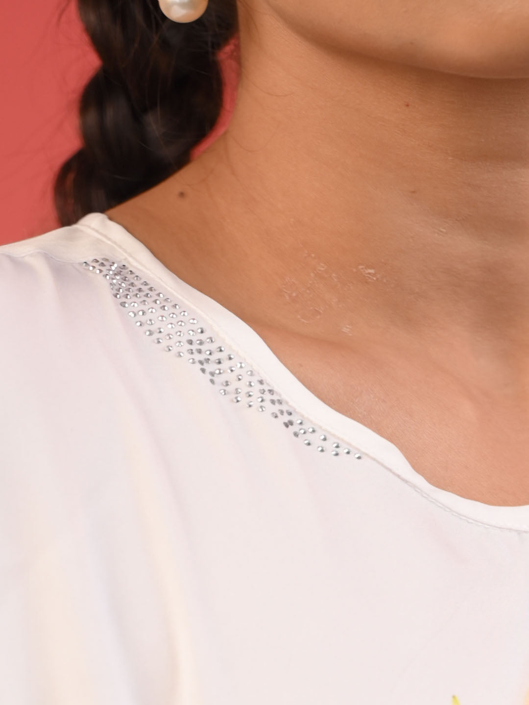 Effortlessly chic and endlessly versatile, the painted floral design printed women’s shirt in flowy fabric is a wardrobe essential that blends comfort with contemporary style. Crafted from lightweight fabric, this shirt offers a graceful drape and airy feel, making it perfect for all-day wear. Adorned with eye-catching prints, tassels and stone embellishments, this shirt adds a pop of personality to any outfit. The relaxed silhouette enhances movement and creates a flattering fit, whether tucked into tailored trousers for work or paired with jeans for a casual outing.