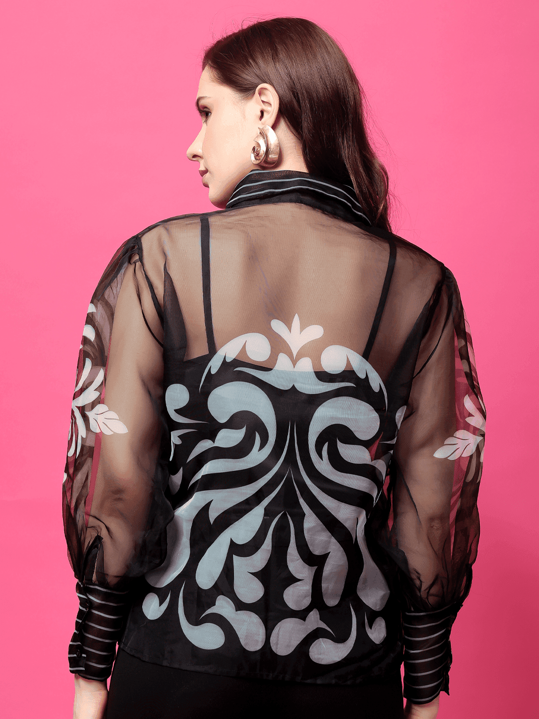 Elevate your wardrobe with our meticulously crafted shirt, made from Organza with a separate lining for a perfect drape and stylization. Available in colors, this shirt features full sleeves and front buttoned closure. The standout feature of this tunic is the sheer look with unique prints. Tassels and laces add a touch of sophistication and flair, making it perfect for both casual and formal settings. Explore luxury and elegance with our Designer Shirt Collection. Handcrafted with precision and care, each shirt is a masterpiece of a woman’s clothing diary of style
