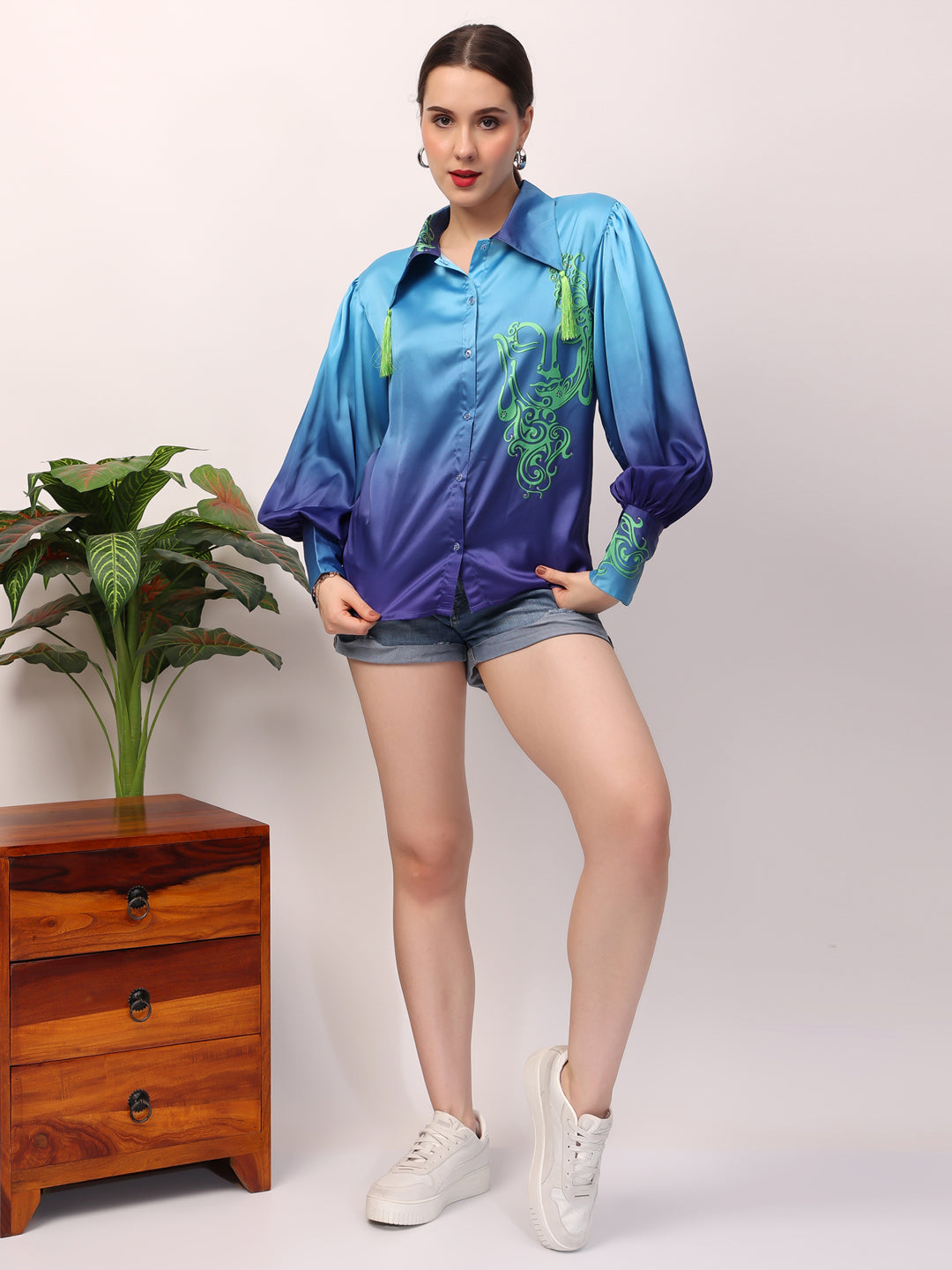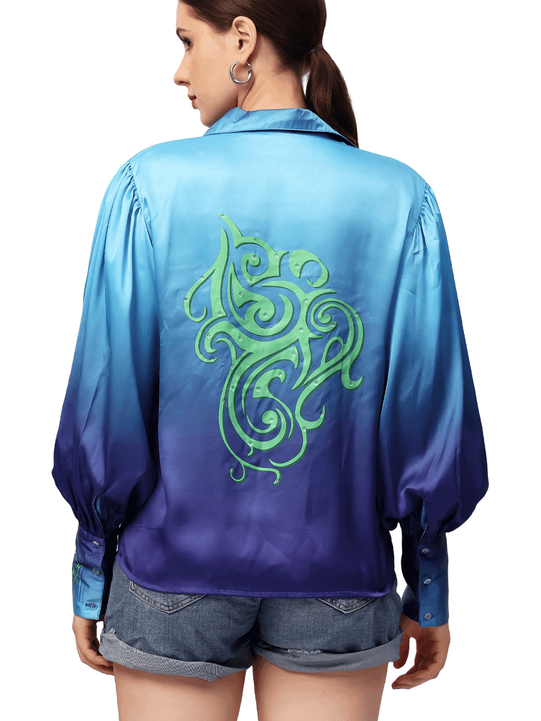 Add a touch of elegance to your wardrobe with our Up Satin Shirt, designed to stand out with its luxurious finish and eye-catching details. Made from high-quality satin, this shirt features a striking ombré print with motifs that gracefully fades from one color to another, creating a dynamic and modern look.