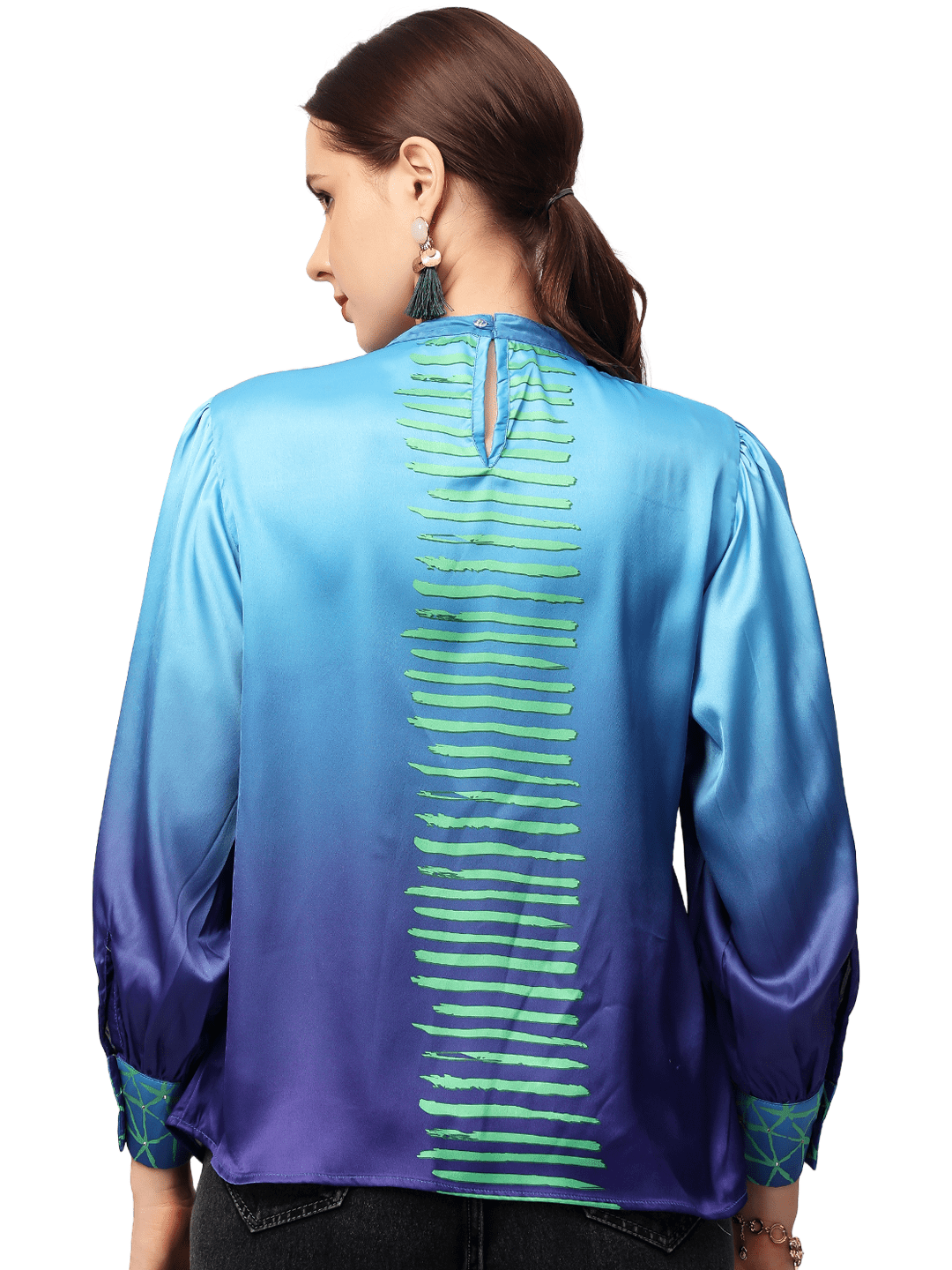 Add a touch of elegance to your wardrobe with our Up Satin Top, designed to stand out with its luxurious finish and eye-catching details. Made from high-quality satin, this top features a striking ombré print with motifs that gracefully fades from one color to another, creating a dynamic and modern look.
