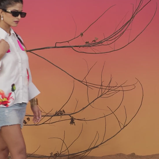 Effortlessly chic and endlessly versatile, the painted floral design printed women’s shirt in flowy fabric is a wardrobe essential that blends comfort with contemporary style. Crafted from lightweight fabric, this shirt offers a graceful drape and airy feel, making it perfect for all-day wear. Adorned with eye-catching prints, tassels and stone embellishments, this shirt adds a pop of personality to any outfit. The relaxed silhouette enhances movement and creates a flattering fit, whether tucked into tailored trousers for work or paired with jeans for a casual outing.