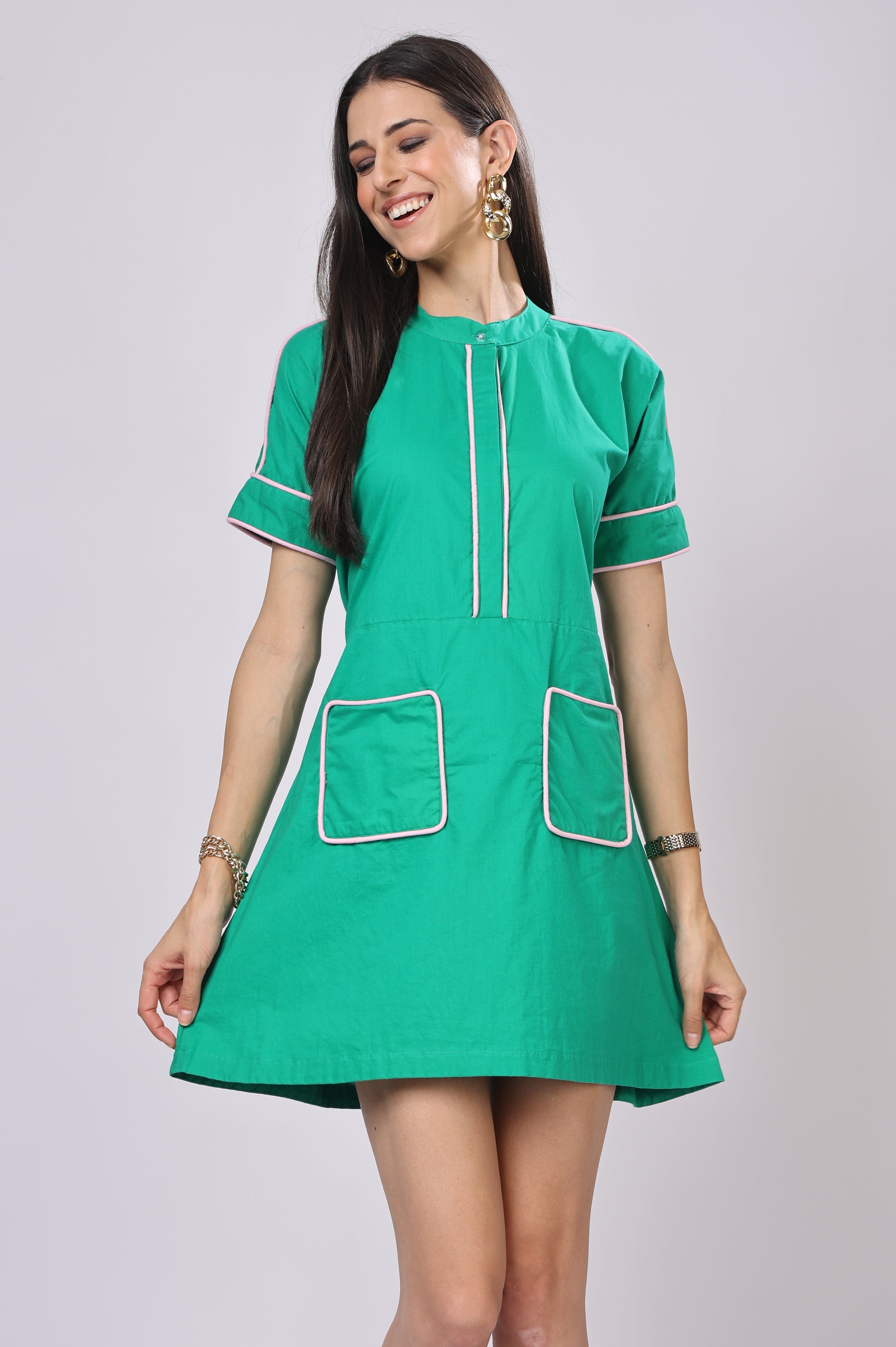 Elevate your wardrobe with our timeless elegant dresses in premium cotton poplin fabric where style meets comfort. "Unapologetically stylish". Featuring Round, raised pipping, color blocks and belt -each piece reflects details and perfect tailoring with high precision.