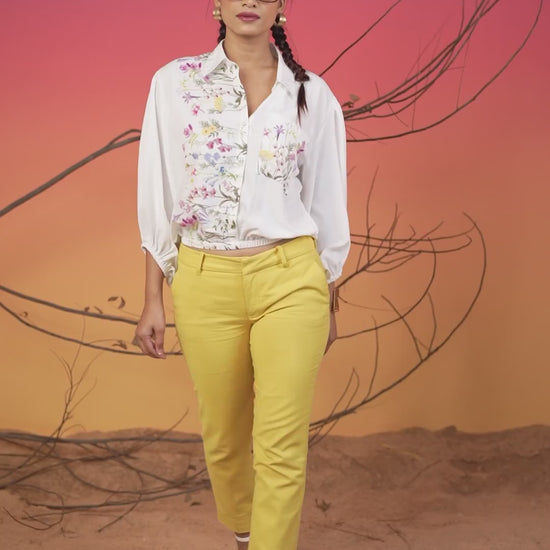 Effortlessly chic and endlessly versatile, the painted floral design printed women’s shirt in flowy fabric is a wardrobe essential that blends comfort with contemporary style. Crafted from lightweight fabric, this shirt offers a graceful drape and airy feel, making it perfect for all-day wear. Adorned with eye-catching prints, tassels and stone embellishments, this shirt adds a pop of personality to any outfit. The relaxed silhouette enhances movement and creates a flattering fit, whether tucked into tailored trousers for work or paired with jeans for a casual outing.