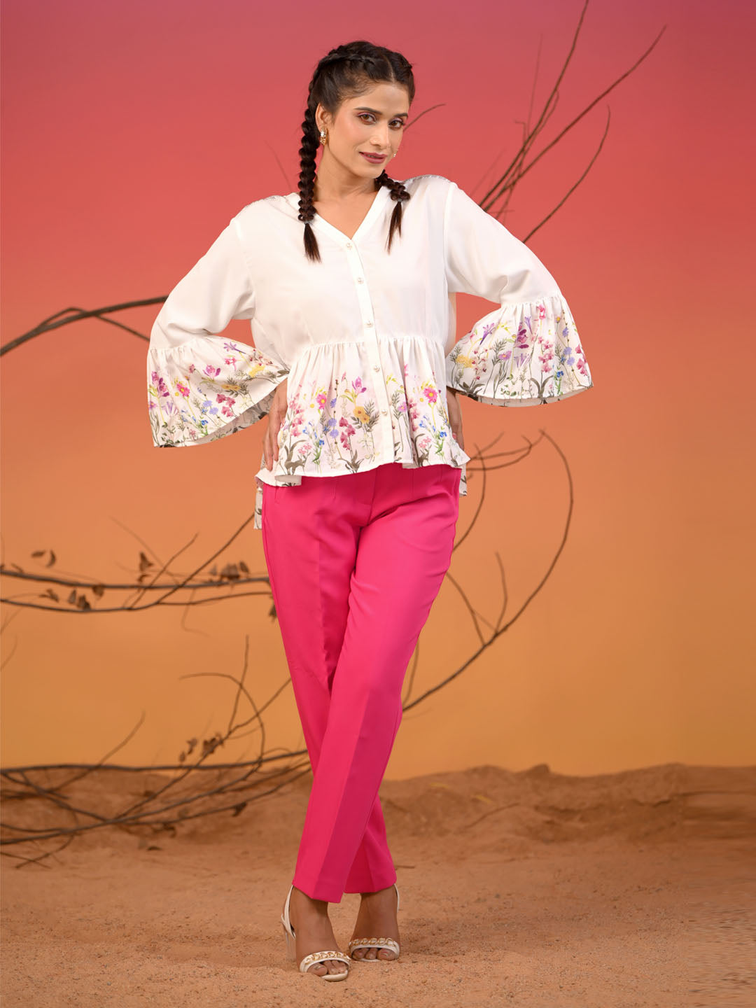 Effortlessly chic and endlessly versatile, the painted floral design printed women’s shirt in flowy fabric is a wardrobe essential that blends comfort with contemporary style. Crafted from lightweight fabric, this shirt offers a graceful drape and airy feel, making it perfect for all-day wear. Adorned with eye-catching prints, tassels and stone embellishments, this shirt adds a pop of personality to any outfit. The relaxed silhouette enhances movement and creates a flattering fit, whether tucked into tailored trousers for work or paired with jeans for a casual outing.