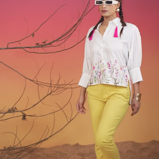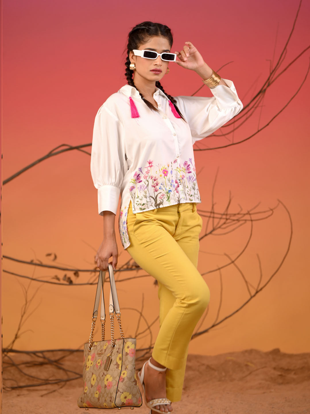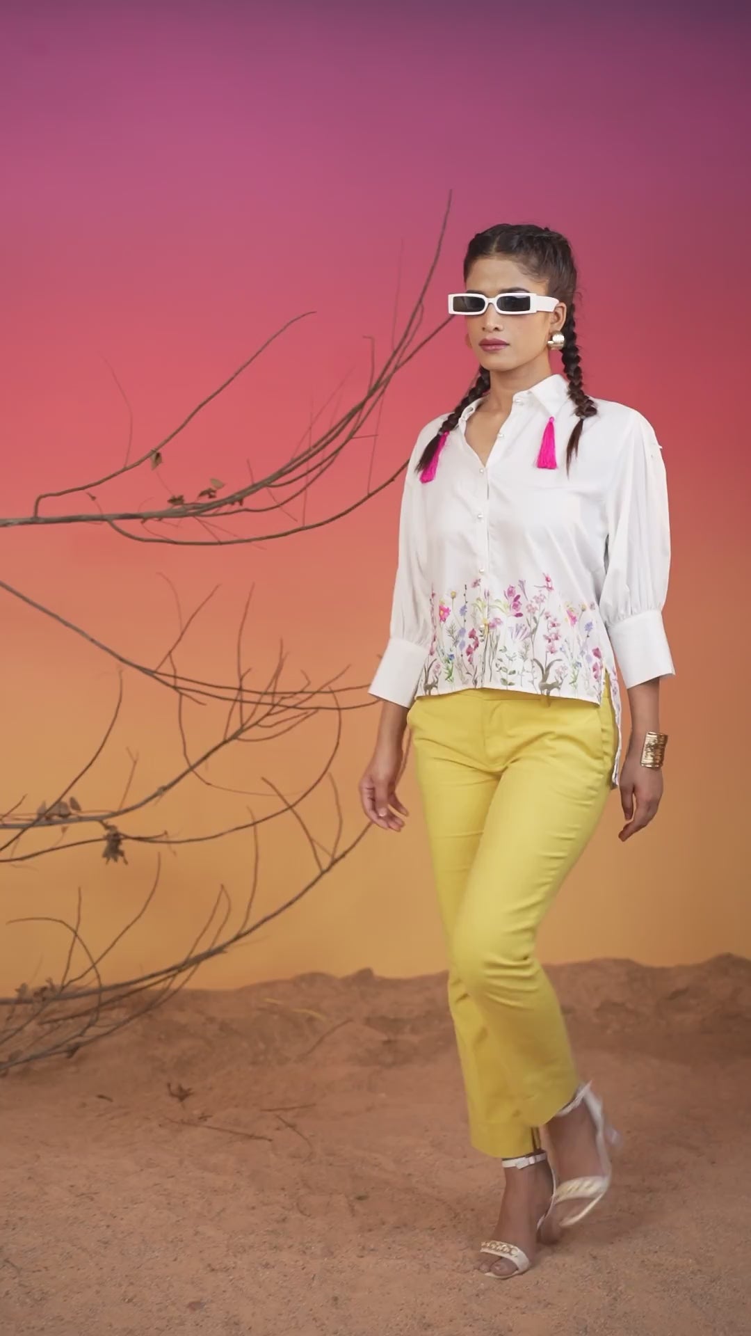Effortlessly chic and endlessly versatile, the painted floral design printed women’s shirt in flowy fabric is a wardrobe essential that blends comfort with contemporary style. Crafted from lightweight fabric, this shirt offers a graceful drape and airy feel, making it perfect for all-day wear. Adorned with eye-catching prints, tassels and stone embellishments, this shirt adds a pop of personality to any outfit. The relaxed silhouette enhances movement and creates a flattering fit, whether tucked into tailored trousers for work or paired with jeans for a casual outing.