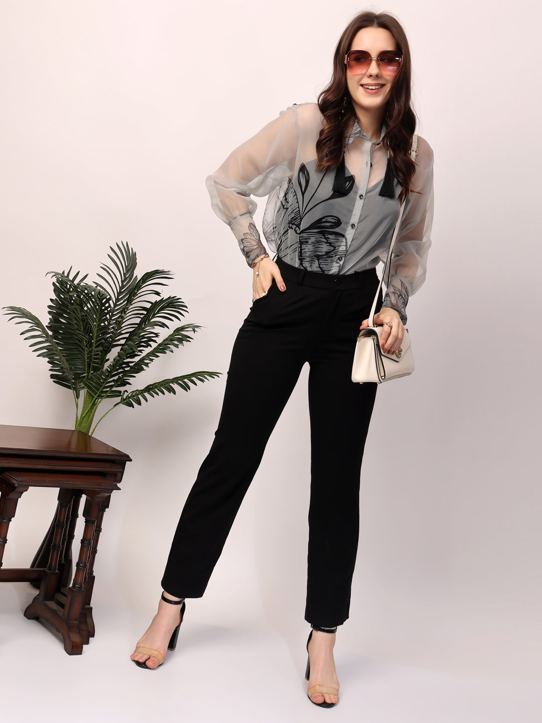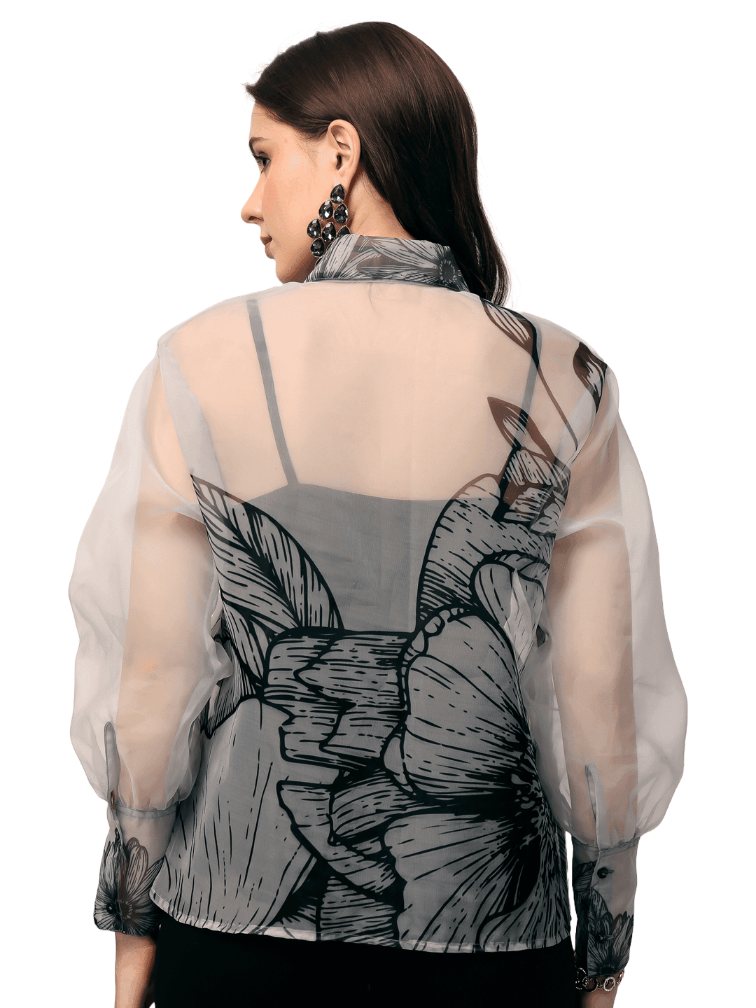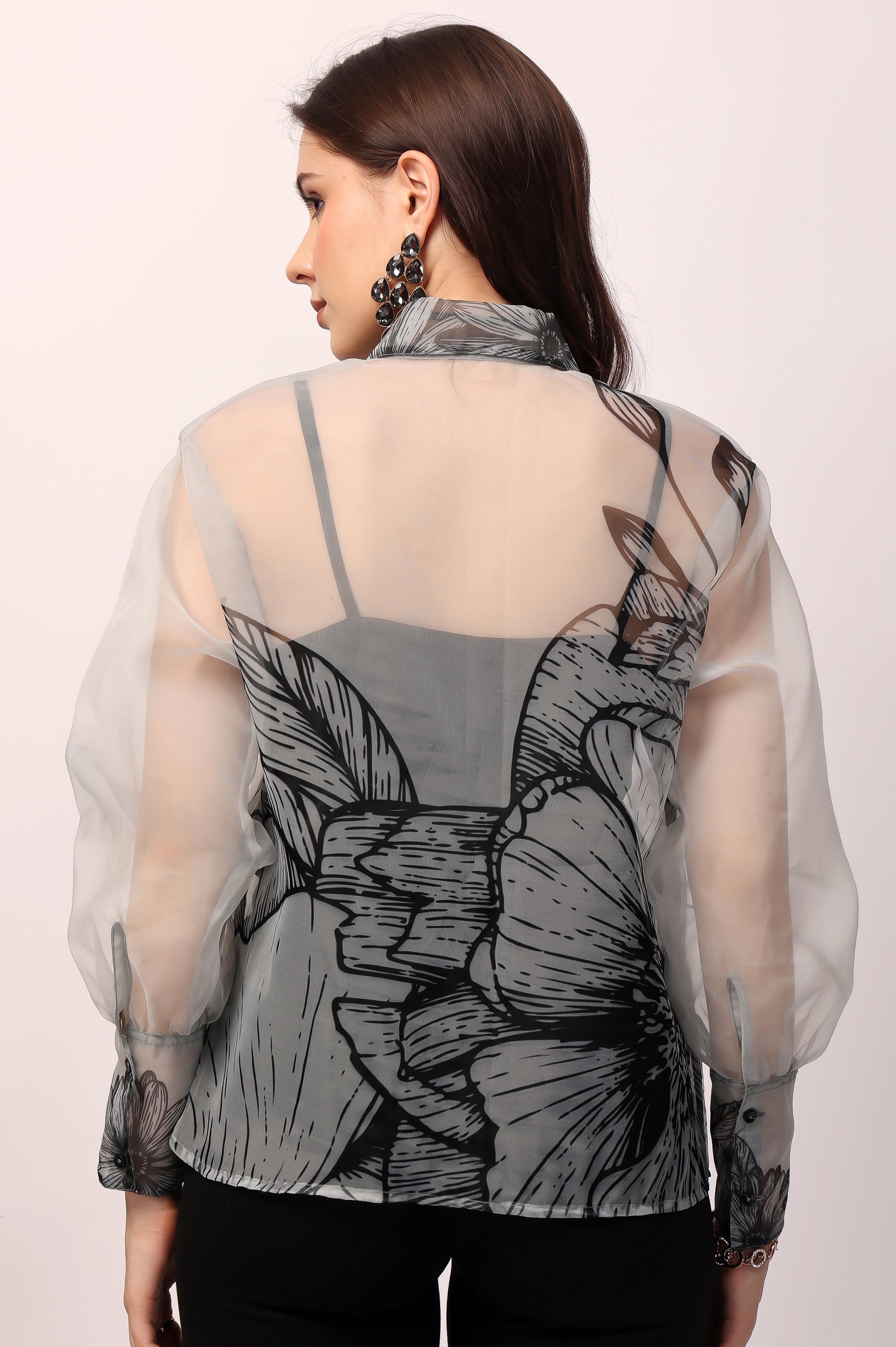 Elevate your wardrobe with our meticulously crafted shirt, made from Organza with a separate lining for a perfect drape and stylization. Available in colors, this shirt features full sleeves and front buttoned closure. The standout feature of this tunic is the sheer look with unique prints. Tassels and laces add a touch of sophistication and flair, making it perfect for both casual and formal settings. Explore luxury and elegance with our Designer Shirt Collection. Handcrafted with precision and care, each shirt is a masterpiece of a woman’s clothing diary of style.