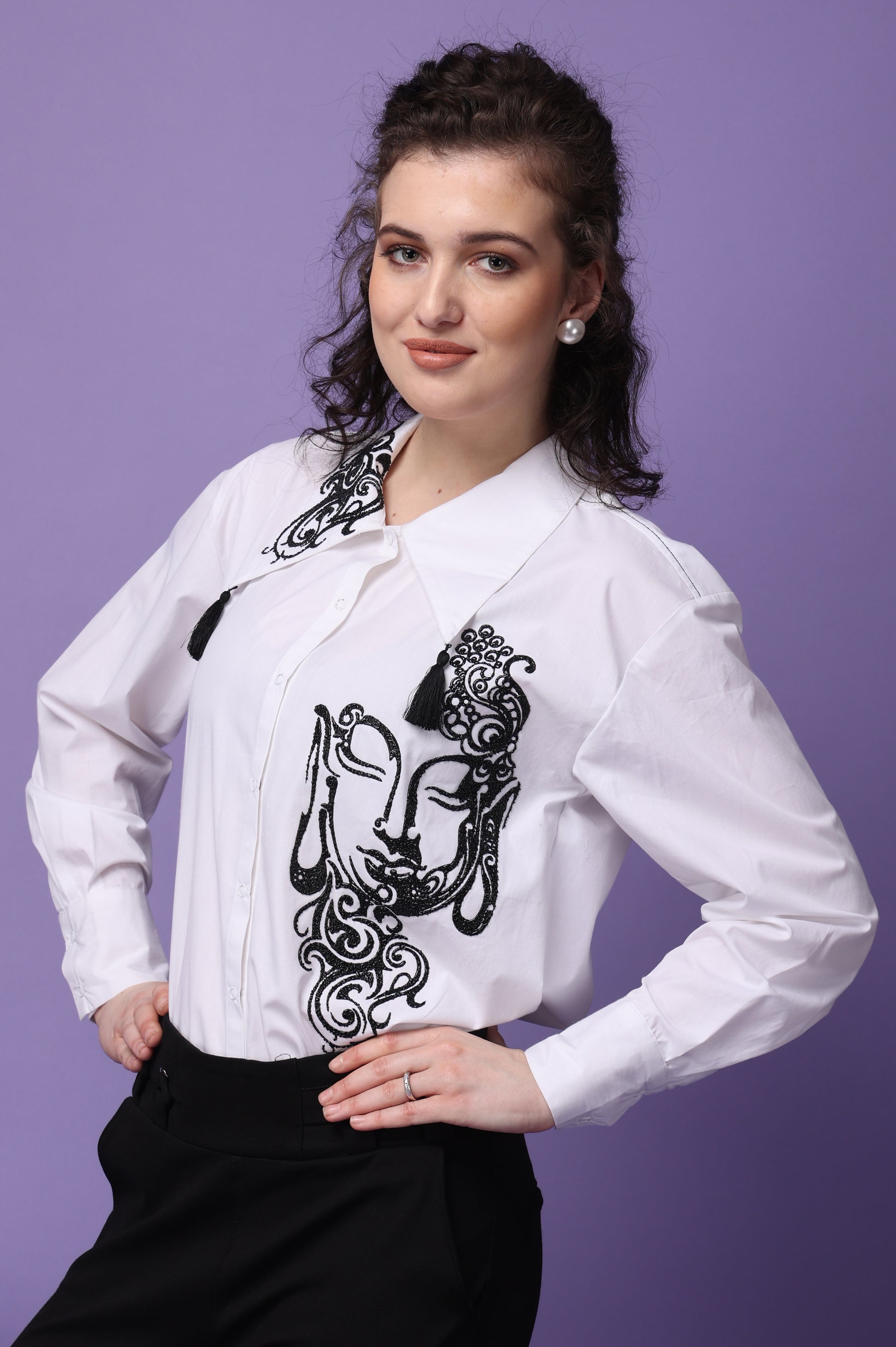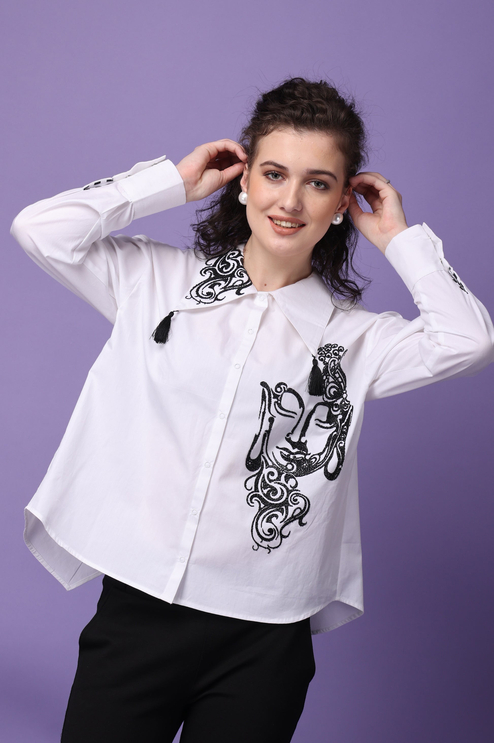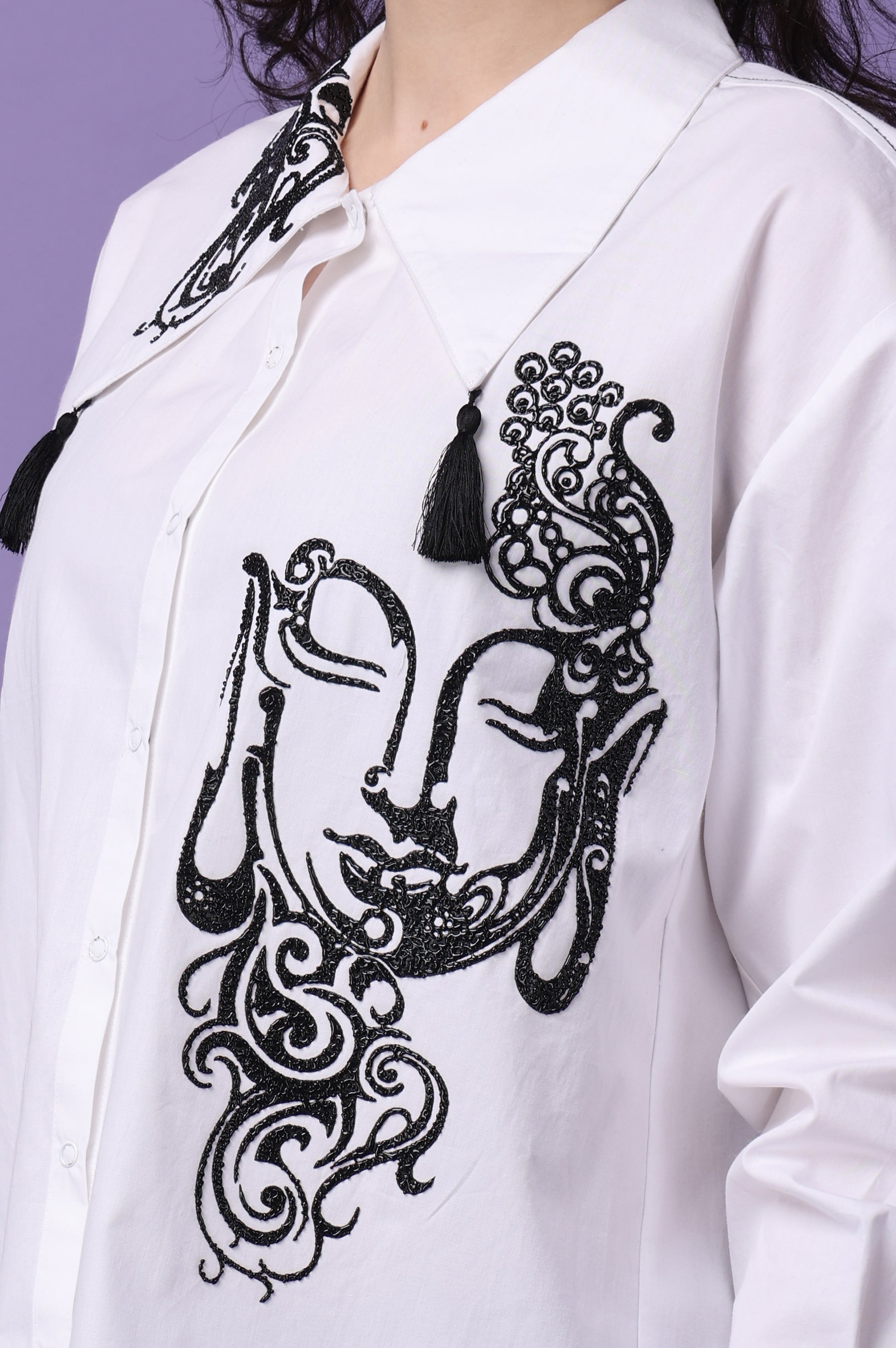Elevate your wardrobe with our meticulously crafted shirt, made from premium cotton for ultimate comfort and durability. Available in classic white, this shirt features full-length sleeves and is secured with convenient snap buttons. The standout feature of this shirt is its unique caviar print, which provides a distinctive raised texture that enhances the fabric's visual appeal and instead of regular flat print. Tassels add a touch of sophistication and flair, making it perfect for both casual and formal settings.