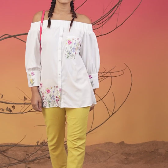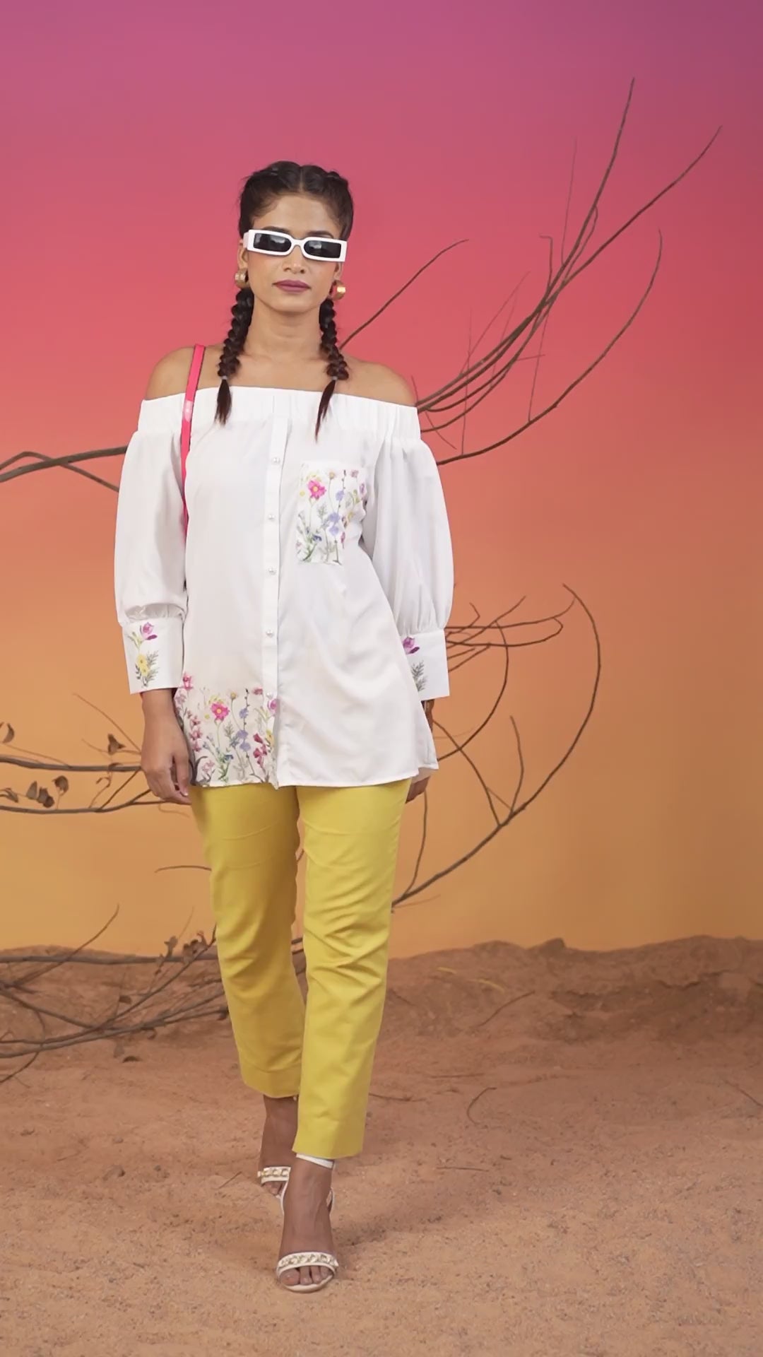 Effortlessly chic and endlessly versatile, the painted floral design printed women’s shirt in flowy fabric is a wardrobe essential that blends comfort with contemporary style. Crafted from lightweight fabric, this shirt offers a graceful drape and airy feel, making it perfect for all-day wear. Adorned with eye-catching prints, tassels and stone embellishments, this shirt adds a pop of personality to any outfit. The relaxed silhouette enhances movement and creates a flattering fit, whether tucked into tailored trousers for work or paired with jeans for a casual outing.