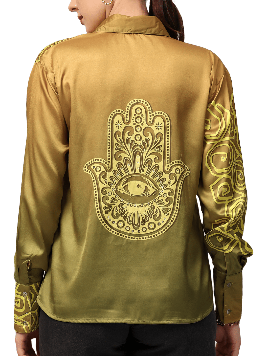 Add a touch of elegance to your wardrobe with our Up Satin Shirt, designed to stand out with its luxurious finish and eye-catching details. Made from high-quality satin, this shirt features a striking ombré print with motifs that gracefully fades from one color to another, creating a dynamic and modern look.