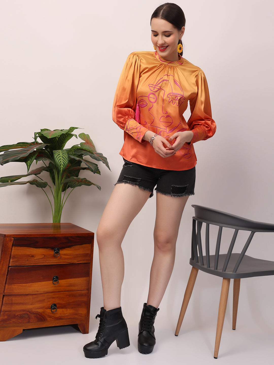 Add a touch of elegance to your wardrobe with our Up Satin Top, designed to stand out with its luxurious finish and eye-catching details. Made from high-quality satin, this top features a striking ombré print with motifs that gracefully fades from one color to another, creating a dynamic and modern look.