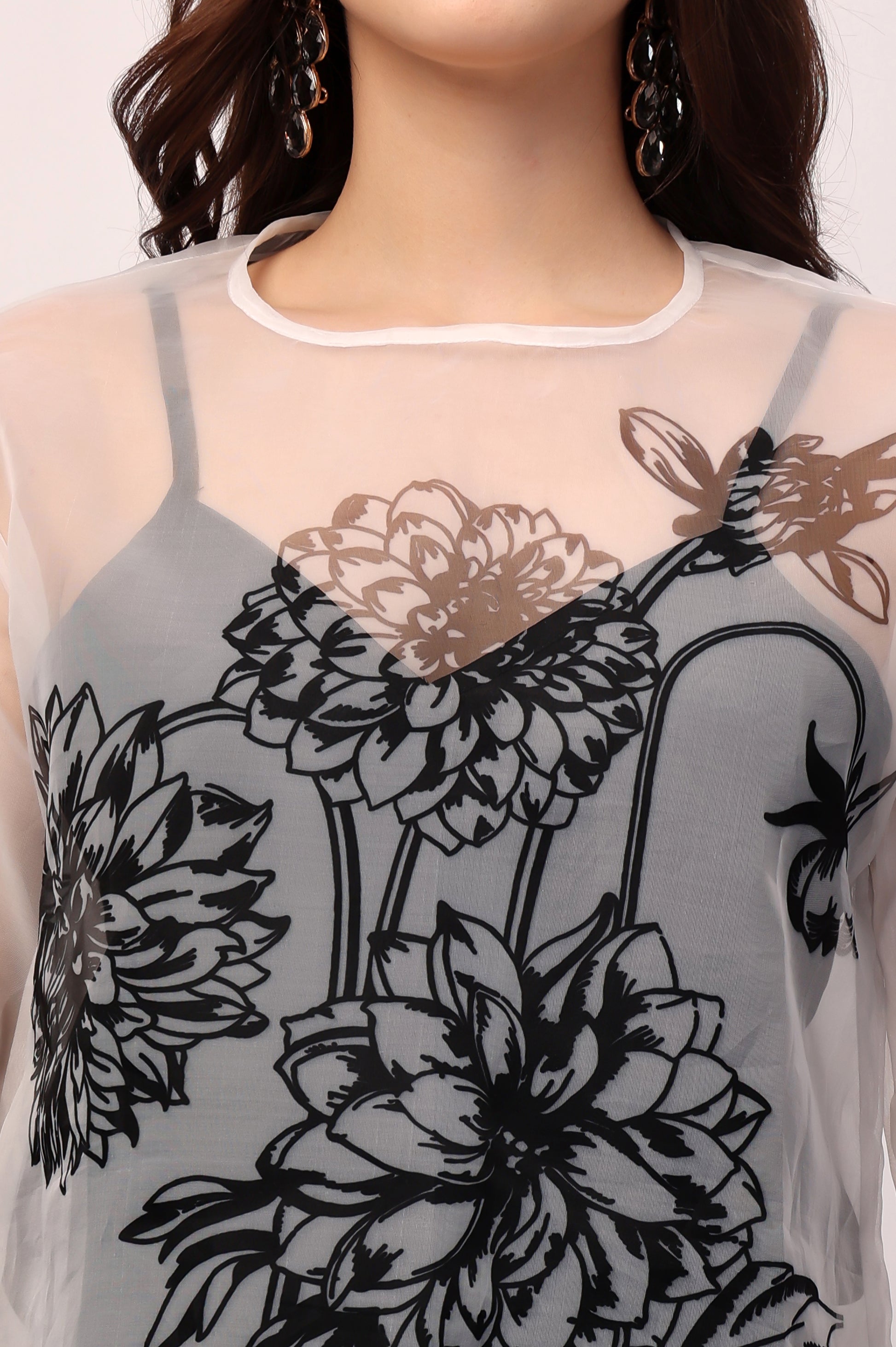 Elevate your wardrobe with our meticulously crafted shirt, made from Organza with a separate lining for a perfect drape and stylization. Available in colors, this style features 3/4th flared sleeves with fringe lace and front closed tunic. The standout feature of this tunic is the sheer look with unique prints. Tassels and laces add a touch of sophistication and flair, making it perfect for both casual and formal settings. Explore luxury and elegance with our Designer Collection. Handcrafted with precision and care, each shirt is a masterpiece of a woman’s clothing diary of style